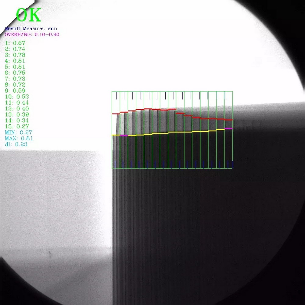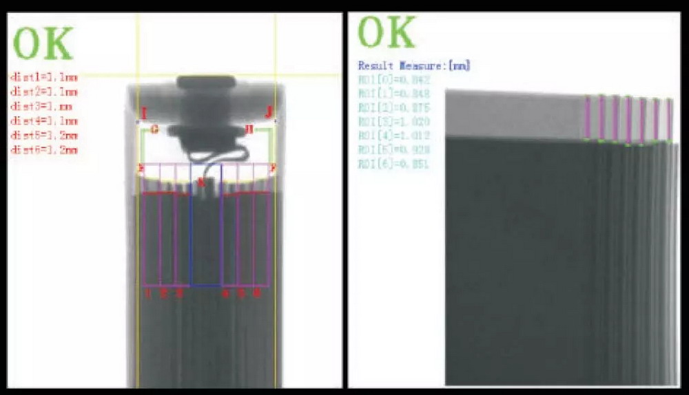 ▲鋁殼電池頭部極耳內(nèi)部結(jié)構(gòu)和正負(fù)極片對齊度檢測