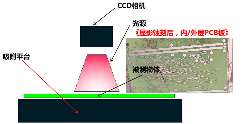 通過(guò)影像成像系統(tǒng)及光源從上表面垂直于被測(cè)板,呈顯影像(相機(jī)實(shí)時(shí)拍圖)感測(cè),并將圖像傳送至電腦測(cè)量軟件,通過(guò)軟件測(cè)量工具分析圖像的“線寬/線距/線寬上下幅/圓/金手指線寬等”標(biāo)準(zhǔn)公差值對(duì)比,從而判斷被測(cè)板上的測(cè)量值OK或NG。