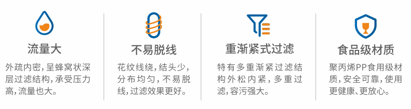 PP濾芯選用100%全新聚丙烯(PP)高分子材料,采用雙機(jī)雙模頭全自動化生產(chǎn)設(shè)備制造而成,產(chǎn)品外疏內(nèi)密,深層過濾,過濾效果好,使用壽命長。
