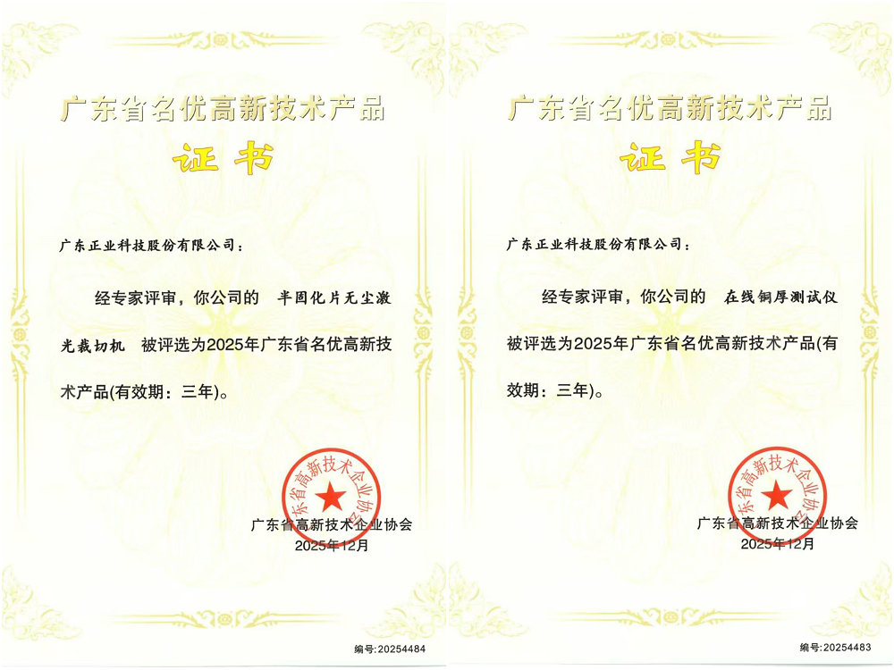 近日,廣東省高新技術(shù)企業(yè)協(xié)會正式公布了2025年第二批廣東省名優(yōu)高新技術(shù)產(chǎn)品評選結(jié)果。廣東正業(yè)科技股份有限公司憑借自主研發(fā)的“半固化片無塵激光裁切機(jī)”和“在線銅厚測試儀”兩款高性能設(shè)備,成功入選“廣東省名優(yōu)高新技術(shù)產(chǎn)品”名單,彰顯了公司在高新技術(shù)產(chǎn)品研發(fā)與制造領(lǐng)域的實力。