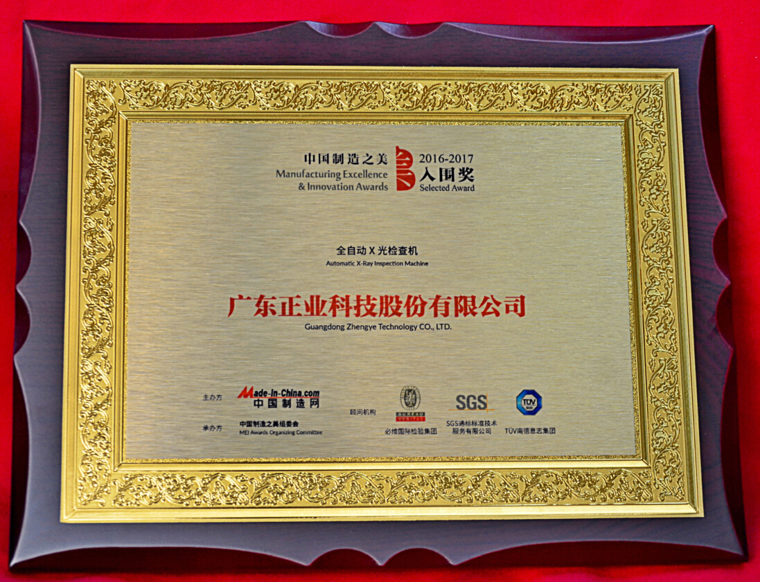 2016年12月,廣東正業(yè)科技股份有限公司的新產(chǎn)品全自動(dòng)X光檢查機(jī),獲得獲得由中國制造之美與SGS、BV、TUV南德三大國際知名認(rèn)證機(jī)構(gòu)聯(lián)合頒發(fā)的榮譽(yù)獎(jiǎng)牌——中國制造之美入圍獎(jiǎng)。該獎(jiǎng)項(xiàng)主要獎(jiǎng)勵(lì)具有創(chuàng)新精神、具備行業(yè)領(lǐng)先技術(shù)水平的新產(chǎn)品和新技術(shù)。