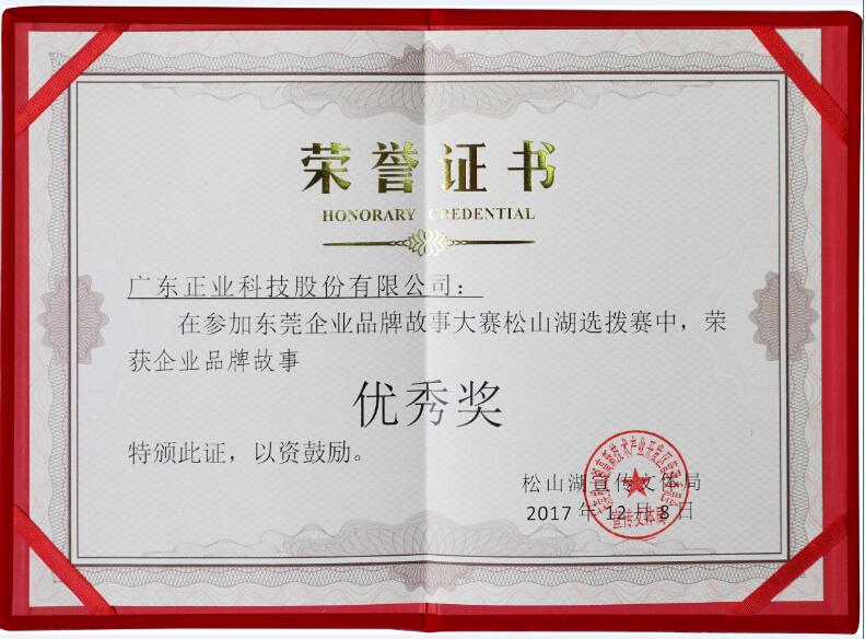 正業(yè)科技市場(chǎng)中心撰寫的《風(fēng)雨同舟攜手廿載,匠心智造鑄就未來》,以正業(yè)科技20年歷程為藍(lán)本,講述正業(yè)科技自主創(chuàng)新走民族品牌之路的故事,榮獲“東莞企業(yè)品牌故事大賽”松山湖選拔賽優(yōu)秀獎(jiǎng)。