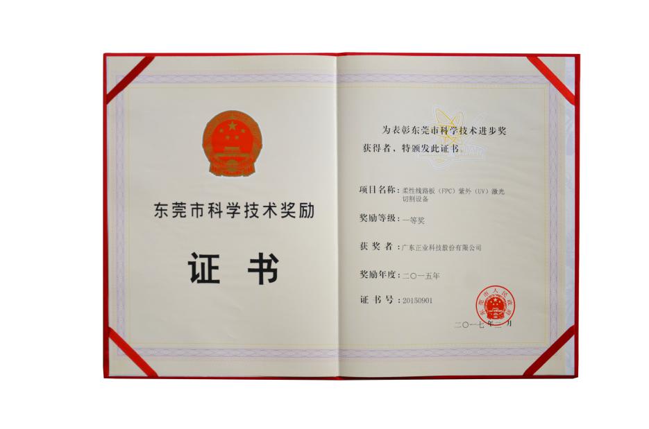 2017年3月,由東莞市政府頒發(fā),廣東正業(yè)科技股份有限公司(股票代碼:300410)榮獲東莞市科技進步一等獎,獲獎項目為“柔性線路板(FPC)紫外(UV)激光切割設(shè)備”。