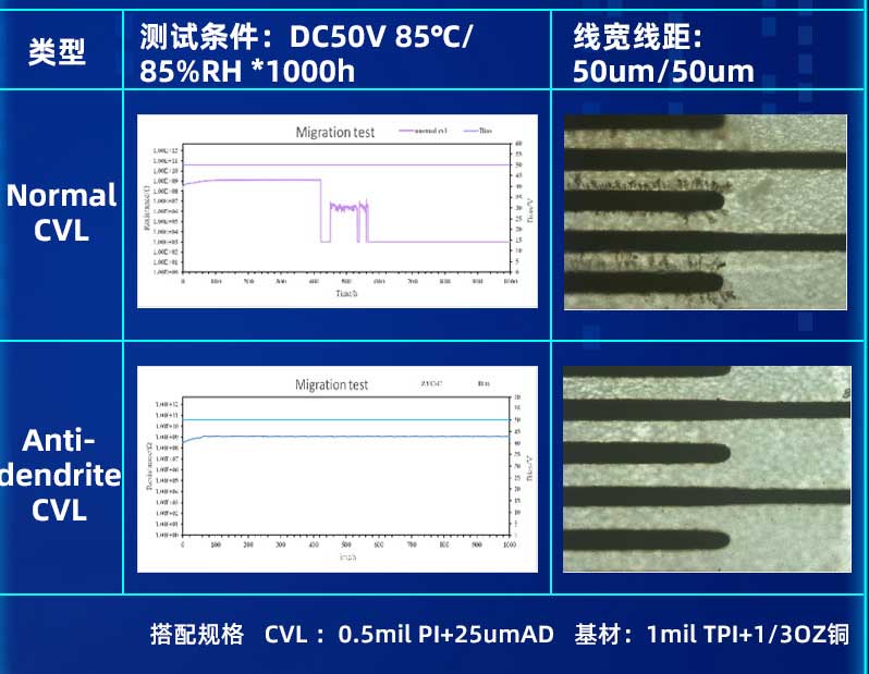 提高PCB基材的耐離子遷移性成為了電子產(chǎn)品開發(fā)中的迫切需求。因此,對(duì)于精細(xì)線路制程工藝,與之匹配的抗枝晶(Anti-dendrite)材料就顯得十分必要??怪Вˋnti-dendrite)材料的使用,能有效降低細(xì)線路間產(chǎn)生枝晶的風(fēng)險(xiǎn),提高FPC的可靠性。